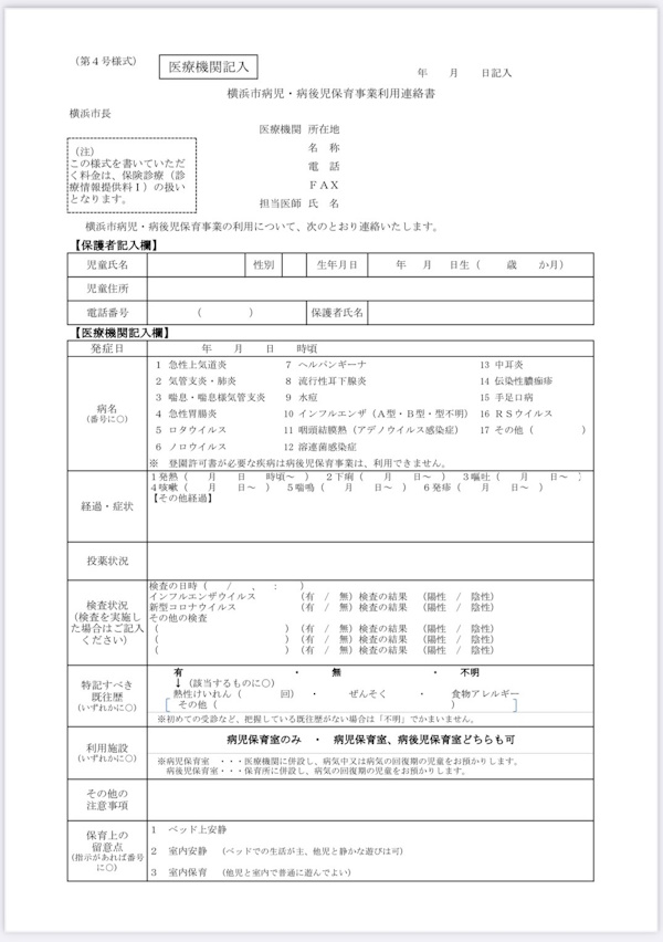 ※医療機関を受診される際に、横浜市のホームページからダウンロード印刷の上、医師に記入の依頼をしてください。料金がかかる場合がございます。医療機関にご確認ください。(「横浜市 病児保育事業」で検索可能です。)