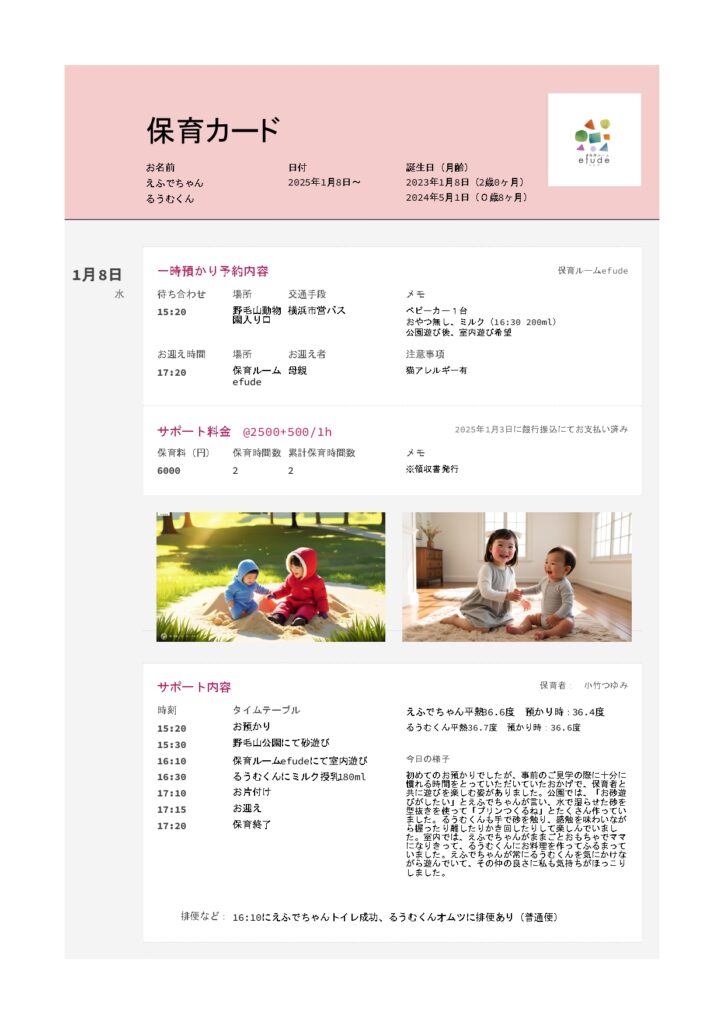 こちらは、サポート終了後にLINE公式アカウントにて個別にお送りする「保育カード」の見本になります。